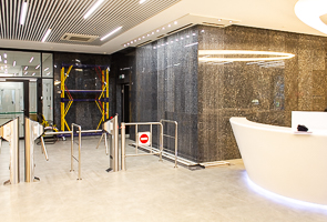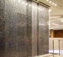 На этот раз монтажникам пришлось лететь на остров Сахалин. Вестибюль офисного здания в городе Южно-Сахалинск архитекторы украсили дизайнерской инсталляцией – струнно-капельный водопад с прерывистой линией струн. Этот объект являет собой пример продуманной интеграции корпусных элементов декоративного водопада в конструкции пола и потолка. Вся технологическая часть при этом скрыта от глаз. Капли словно стекают с потолка и уходят в пол, обрамленный белой галькой. Техническое обслуживание оборудования производится в техническом помещении, что позволяет выполнять регламентные работы в любое время, не доставляя неудобства посетителям.