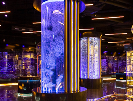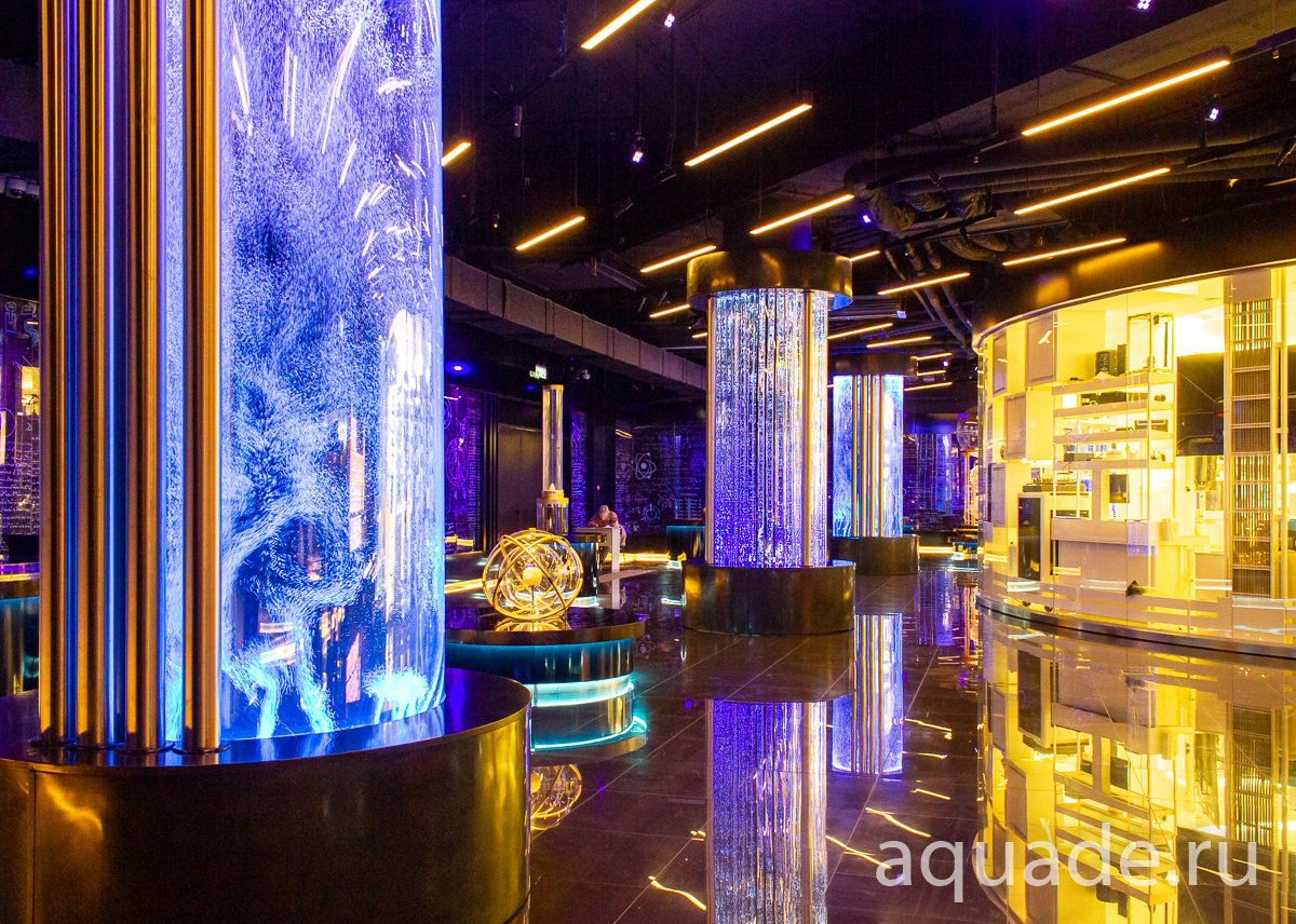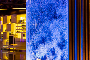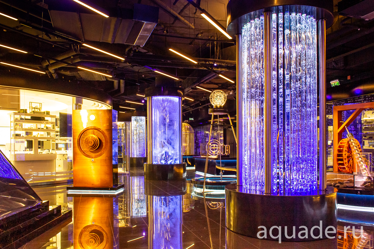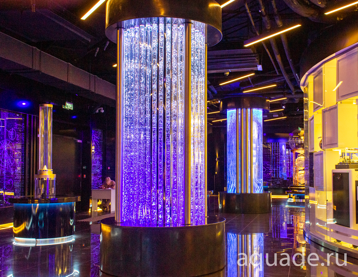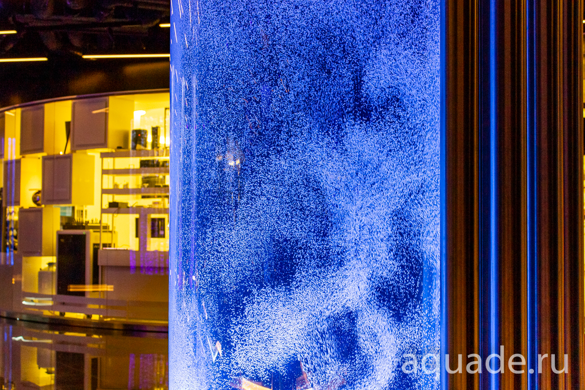 Композиция представляет собой семь элементов: четыре инсталляции с цилиндрическими монопанелями, чередующиеся с тремя пузырьковыми колоннадами, состоящими из 38 тонких труб каждая. Такое сочетание позволяет исключить монотонность восприятия турбулентных потоков пузырьков и задать вектор вертикального поступательного движения.
