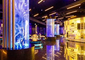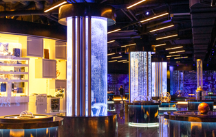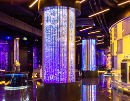 Извечная «головная боль» архитекторов и дизайнеров – декорирование несущих бетонных колонн – превратилась из проблемы в прекрасную возможность внести в интерьер мощную динамику, локальные цветовые и световые акценты, технологическую оригинальность, естественность и гармонию природных процессов. Словно Атланты, поддерживающие небосклон, наши колонны устремлены ввысь и несут на себе темный свод.