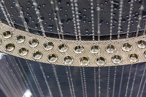 Жилой комплекс «Панорама» в городе Ижевск. Именно здесь прописался наш новый цилиндрический струнно-капельный водопад. Возможность обзора его поверхности со всех сторон напоминает о названии этого здания. Фактурная поверхность колонны, покрытая уютным мхом, подчеркивает природную тематику инсталляции.