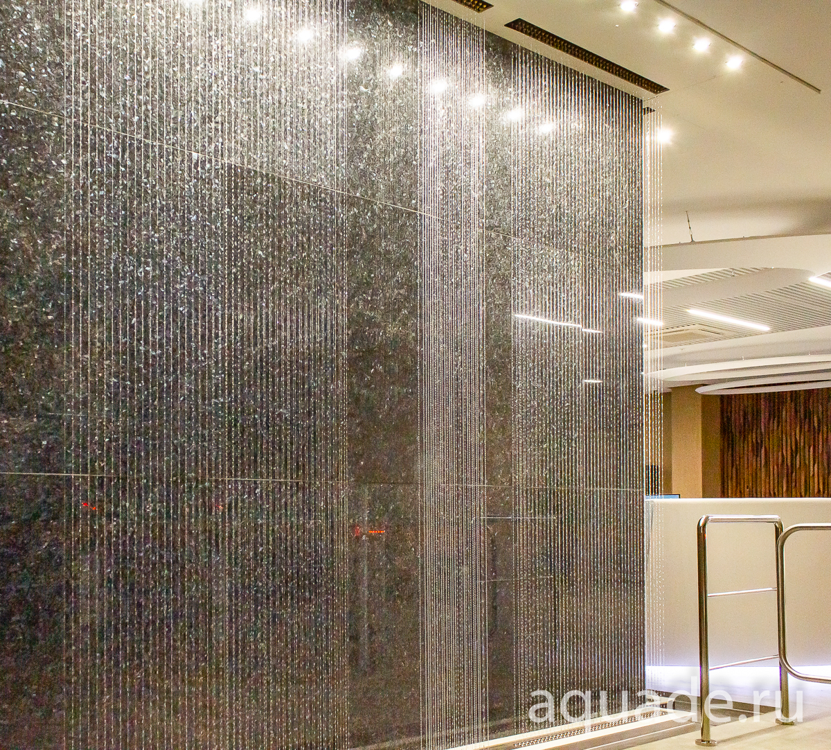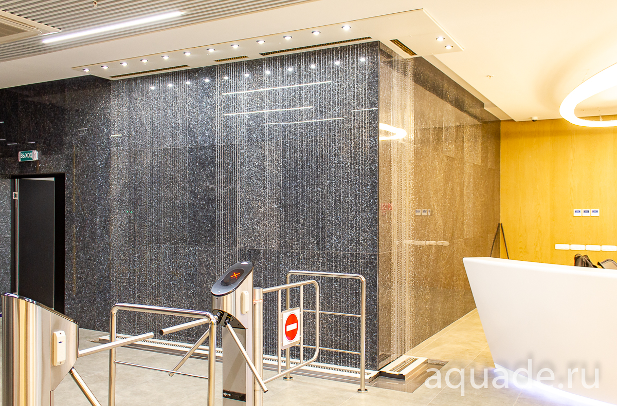 На этот раз монтажникам пришлось лететь на остров Сахалин. Вестибюль офисного здания в городе Южно-Сахалинск архитекторы украсили дизайнерской инсталляцией – струнно-капельный водопад с прерывистой линией струн. Этот объект являет собой пример продуманной интеграции корпусных элементов декоративного водопада в конструкции пола и потолка. Вся технологическая часть при этом скрыта от глаз. Капли словно стекают с потолка и уходят в пол, обрамленный белой галькой. Техническое обслуживание оборудования производится в техническом помещении, что позволяет выполнять регламентные работы в любое время, не доставляя неудобства посетителям.