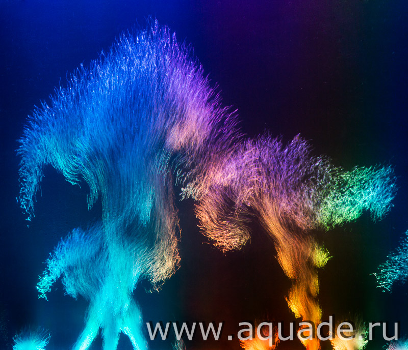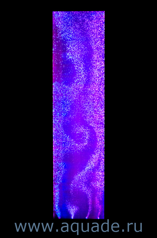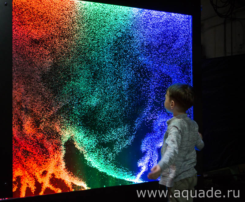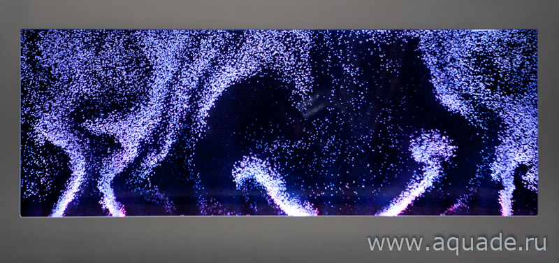 Пузырьки воздуха, выходя из нескольких форсунок, поднимаются свободно, не ограниченные перегородками, однако захватываются течением жидкости и образуют удивительные картины турбулентного движения. Включение каждой из форсунок происходит в определенной последовательности, что стимулирует завихрение внутренних потоков. Непредсказуемость траектории движения пузырьков привлекает внимание и завораживает. Светодиодная подсветка позволяет пузырькам светиться равномерно по всей плоскости панели, делает их заметными даже в ярко освещенном помещении.