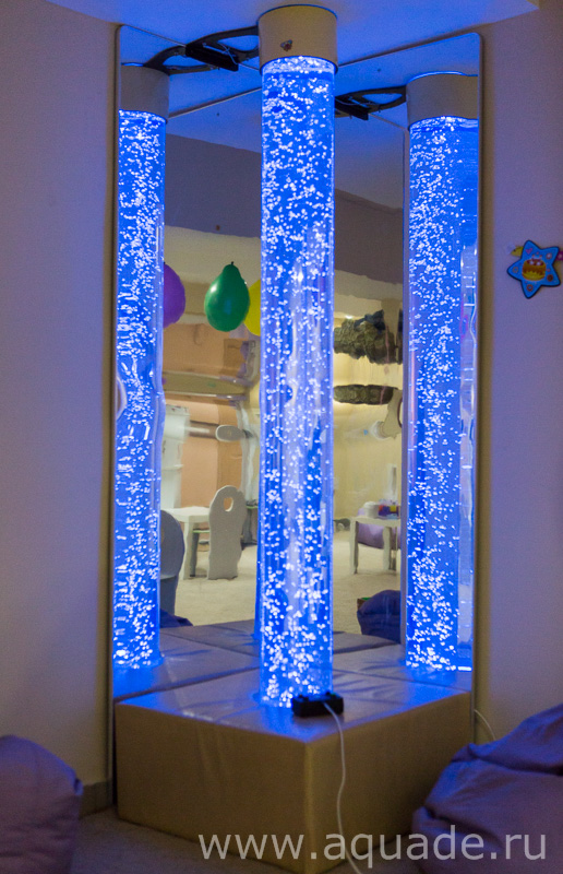 Обязательный атрибут сенсорной комнаты — пузырьковая колонна. Она создает успокаивающую атмосферу, уют. Вовлекает зрителя в фантазийный мир подводного царства, фантастической световой игры. Колонна может просто украшать интерьер, а может реагировать цветом на звуки или нажатия клавиш. Двухсторонняя четырехцветная светодиодная подсветка равномерно окрашивает пузырьки воздуха по всей высоте колонны. Плавная смена цветов образует переходные оттенки, которые разнообразят цветовую картину.