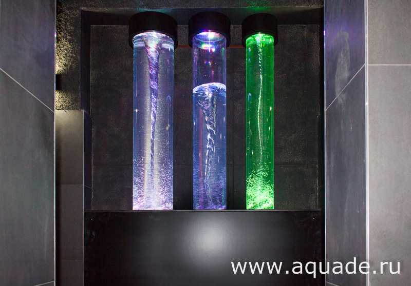 Колонна сочетает в себе эффекты водной воронки и спирали пузырьков воздуха. Цикличность включения оборудования позволяет наблюдать разнообразные водные картины: образование широкой воронки с зеркальной поверхностью с одновременным наполнением колонны, превращение воронки в прямой вибрирующий столб с винтовой поверхностью, затем столб утончается и образуется тонкий танцующий змеевидный шнур. Уровень воды в колонне понижается и одновременно с этим начинают образовываться спирали пузырьков воздуха. В верхней части колонны пузырьки поглощаются уже ослабевающей воронкой, а по мере ее угасания пузырьки достигают поверхности воды в своем круговом движении.
