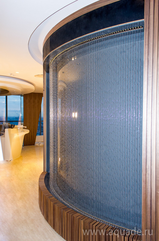 Три водопада изогнутой формы, различных размеров интегрированы в стену, которая словно перетекает из одного пространства в другое. Использование в отделке ценных пород дерева насыщает офис теплом и комфортом.